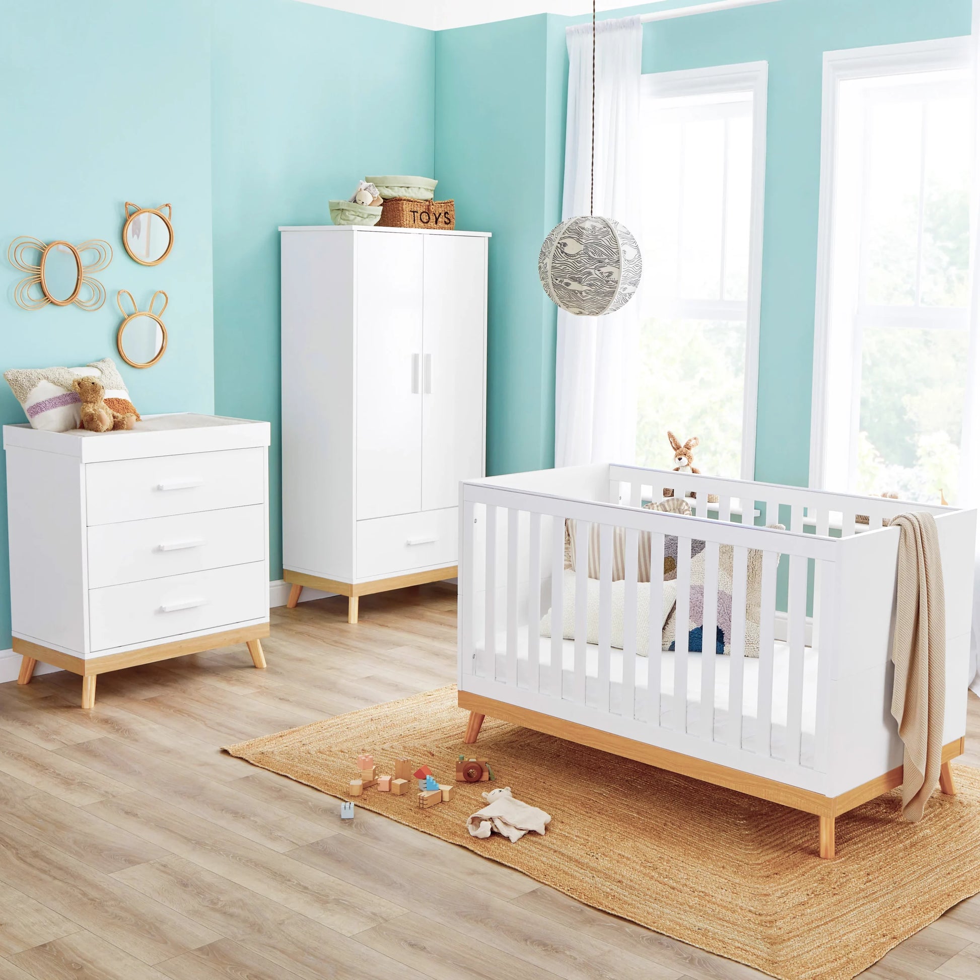 - Complete 3-piece set: cot bed, changer, and wardrobe