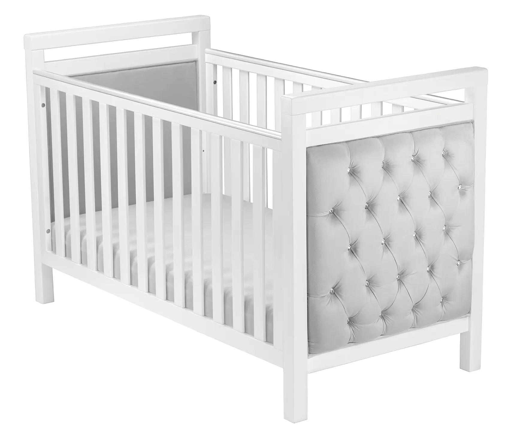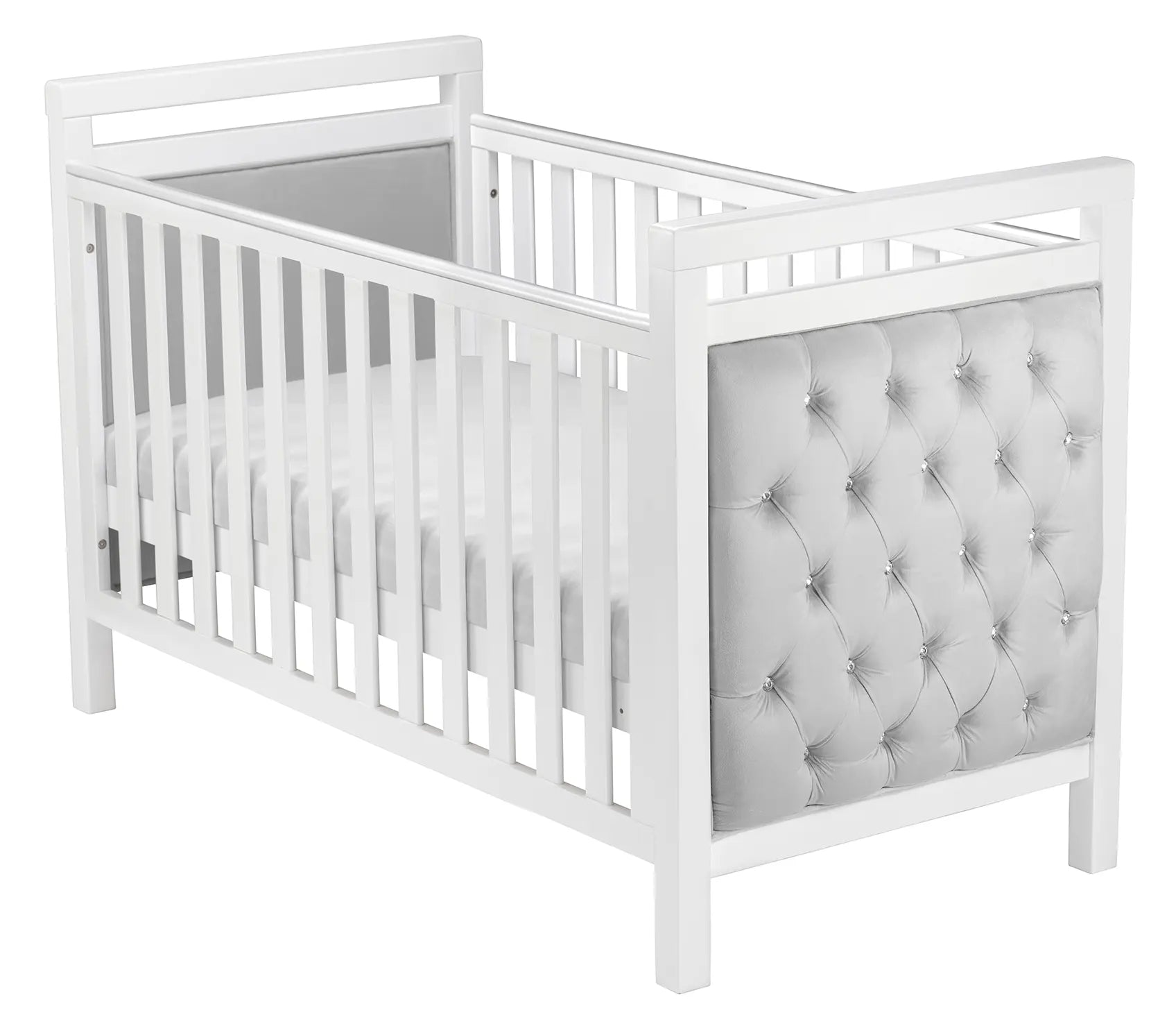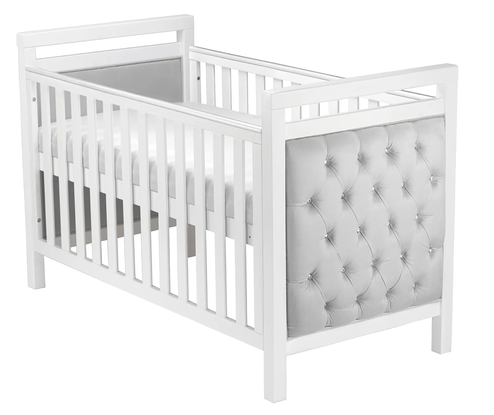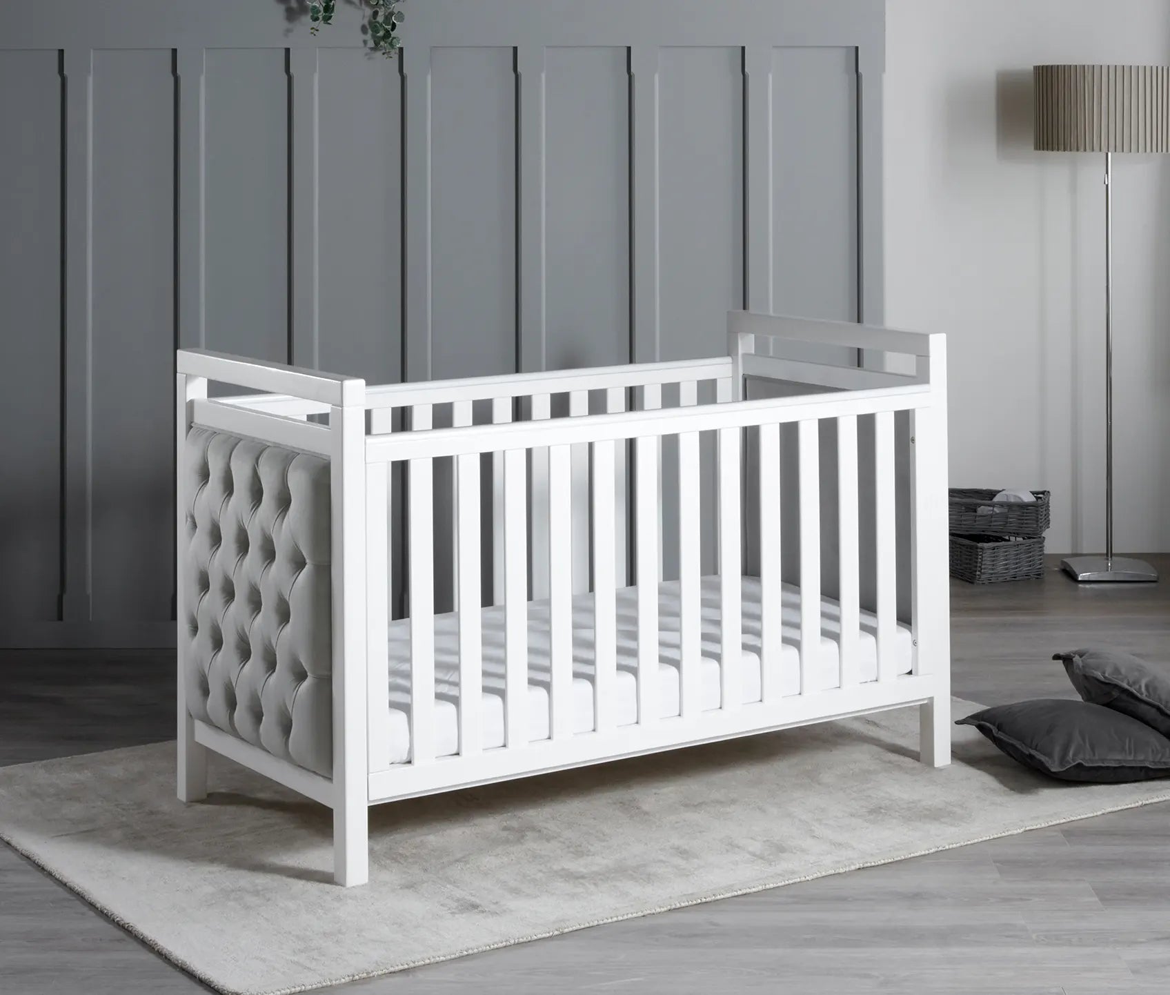 The Babymore Velvet Deluxe Cot Bed in white features a luxurious velvet-upholstered design that brings elegance and comfort to your baby’s nursery. Built to last, it transitions smoothly from a cot to a toddler bed, offering long-term use with a stylish finish.